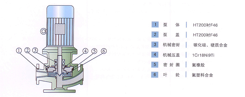 1、GF系列氟塑料管道泵為立式結構,進出口口徑相同,且位于同一中心線上;