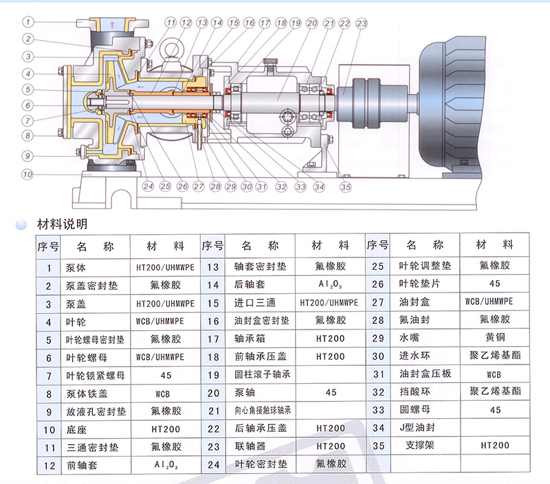 采用軸向進口,徑向出口方式,葉輪采用半開式、流道寬,在輸送含有顆粒的漿料時不易堵塞,抗結晶、耐顆粒。